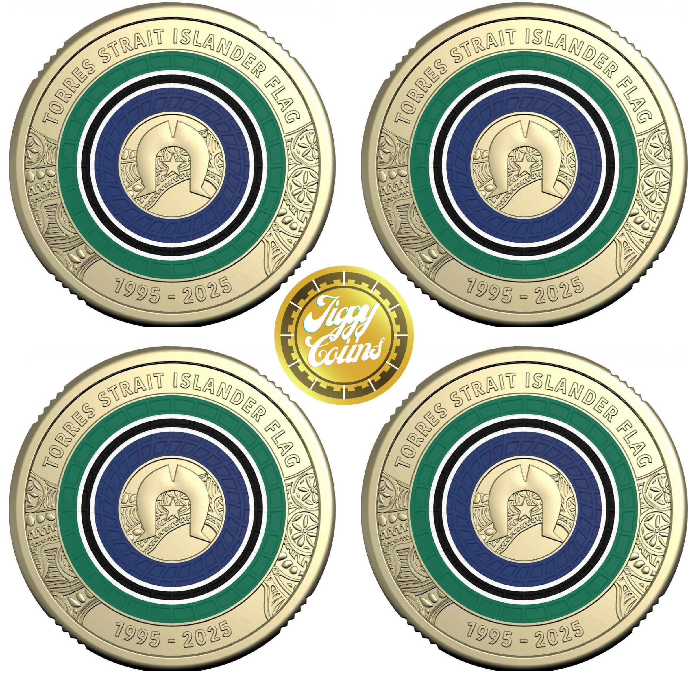 You are purchasing a set of 4 x UNC 2025 $2 Torres Strait Islander Flag two dollar coloured coin taken directly out of a RAM rolls.